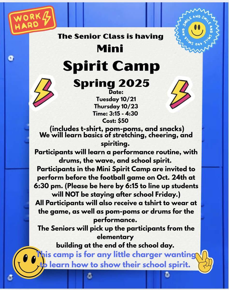 Come join the Senior Class as they teach the little chargers how to show their school spirit. (This is sponsored by the Senior Class not mini cheer)